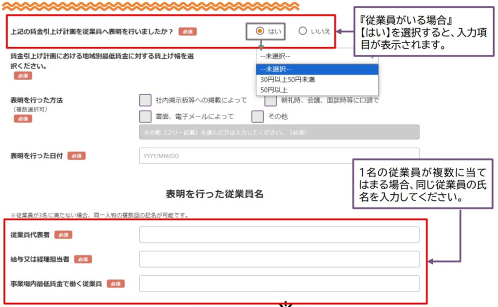 代わりに、「事業期間内に従業員を雇用する場合に賃上げを行いますか?」という設問に対して「はい」を選択することで加点となります。