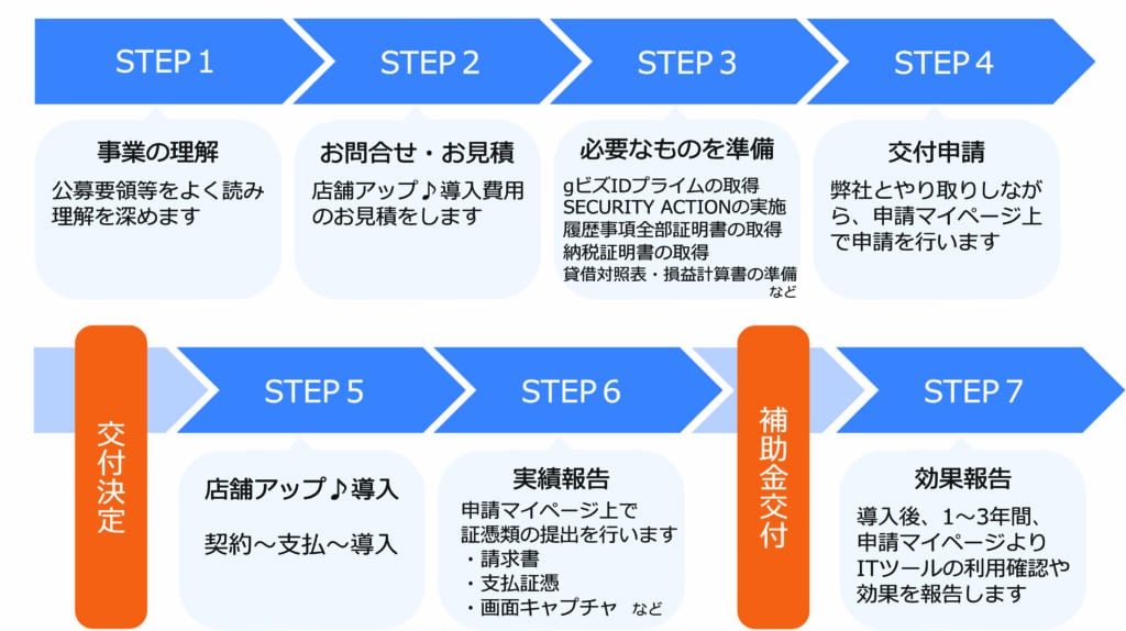 デジタル化・AI導入補助金は、Web上で申請を行います。補助事業者(店舗様)とIT支援事業者(弊社)とでやり取りしながら共同で申請を進めていきます。公募要領を見ると、手続きが複雑に感じられるかもしれませんが、1つ1つは難しくありません。また、弊社が窓口となって申請から経年の効果報告までサポートしますので、ご安心ください。